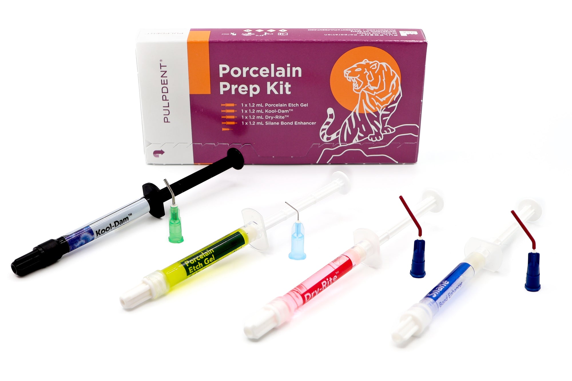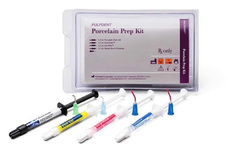- Kit contains: 1 x 1.2 mL Porcelain Etch Gel Syringe, 1 x 1.2 mL Kool-Dam Syringe, 1 x 1.2 mL Dry-Rite Syringe, 1 x 1.2 mL Silane Bond Enhancer Syringe + 8 Pre-bent Tips